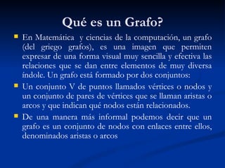 Este documento introduce la teoría de grafos. Explica que un grafo consiste en un conjunto de vértices y aristas que representan la relación entre ellos. Da ejemplos de cómo los grafos pueden modelar sistemas como redes de aeropuertos o carreteras. Describe que los vértices se representan como puntos y las aristas como líneas entre vértices. También cubre conceptos como grafos dirigidos y multigrafos.