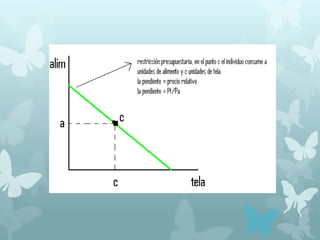 Este documento presenta un resumen de 10 temas clave de la teoría microeconómica de la demanda. Estos incluyen el análisis de indiferencia, la utilidad marginal decreciente, la tasa marginal de sustitución, la restricción presupuestaria, el equilibrio del consumidor, las funciones de consumo-ingreso y consumo-precio, la curva ordinaria de demanda, y los efectos ingreso y sustitución según los métodos de Hicks y Slutsky.