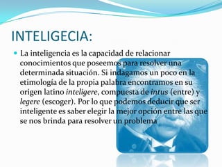 La teoría de las inteligencias múltiples propone que la inteligencia no es unitaria sino que está compuesta por distintas capacidades específicas como la lingüística, lógico-matemática, corporal-kinestésica, espacial, musical, interpersonal e intrapersonal. Gardner define la inteligencia como la capacidad de resolver problemas o crear productos valiosos para una cultura.