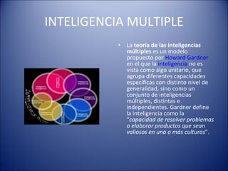 Este documento resume la teoría de las inteligencias múltiples de Howard Gardner, la cual propone que la inteligencia no es unitaria sino múltiple e independiente. Define 8 tipos de inteligencia: espacial, musical, naturalista, lingüística, emocional, interpersonal e intrapersonal. Para cada una provee una definición, ejemplos y aplicaciones profesionales.