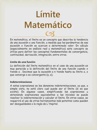 Este documento trata sobre la teoría de límites en matemáticas avanzadas. Explica que un límite describe la tendencia de una sucesión o función cuando sus parámetros se acercan a un valor determinado, y que este concepto se utiliza para definir nociones fundamentales como convergencia, continuidad y derivación. También define el límite de una función como la sucesión que tiende a su límite, y menciona que las expresiones indeterminadas surgen cuando no está claro el límite, requiriendo en ocasiones herramientas como desigualdades