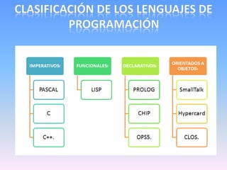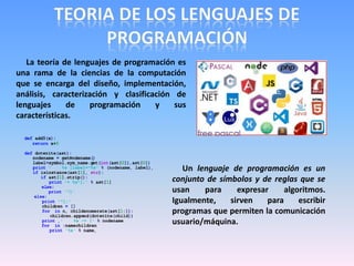 La teoría de lenguajes de programación se encarga del diseño, análisis y clasificación de lenguajes de programación. Un lenguaje de programación es un conjunto de símbolos y reglas que se usan para expresar algoritmos y escribir programas que permiten la comunicación usuario-máquina. Algunos ejemplos de lenguajes de programación son Fortran, Algol, Ada, Pascal, C y C++.