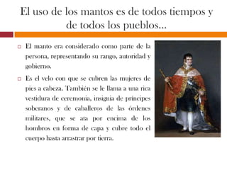 El documento describe diferentes usos y significados simbólicos del manto a través de la historia y la Biblia. El manto representaba autoridad, dignidad y estatus. En la Biblia, el manto simbolizaba la transferencia de poder profético, el favor real, y la sanidad y justicia de Dios. Jesús usó el manto para sanar a los enfermos cuando lo tocaban.