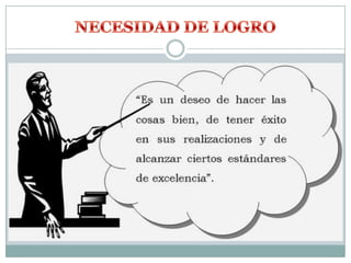 La teoría de McClelland sobre la motivación establece que las tres necesidades dominantes que impulsan la motivación de una persona son el logro, el poder y la afiliación. McClelland desarrolló pruebas proyectivas para identificar la necesidad dominante de una persona mediante el análisis de historias espontáneas generadas en respuesta a imágenes ambiguas, lo que puede ayudar a recomendar un tipo de trabajo adecuado.