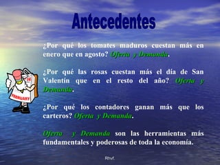 El documento habla sobre la teoría de la oferta y la demanda. Explica que la cantidad demandada de un bien depende de su precio, siendo mayor la demanda a precios más bajos. También explica que la cantidad ofrecida por los proveedores depende del precio, siendo mayor la oferta a precios más altos. Finalmente, indica que la oferta y la demanda son herramientas fundamentales para entender la economía.