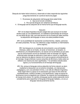 Este documento presenta cuatro preguntas relacionadas con la teoría de Piaget sobre la adquisición del lenguaje. La primera pregunta se refiere a si existe una edad límite para adquirir el lenguaje, la segunda se refiere a la función simbólica, la tercera a por qué las lenguas son sistemas semióticos y la cuarta compara la adquisición del lenguaje oral y escrito.