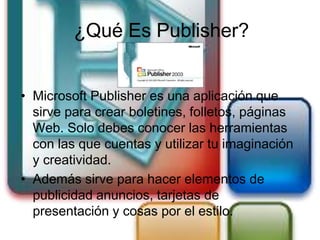 Este documento proporciona una introducción a Microsoft Publisher. Explica que Publisher es una aplicación que permite crear boletines, folletos, páginas web y más utilizando herramientas de diseño. También describe algunas de las ventajas y características clave de Publisher como su facilidad de uso y capacidad de crear materiales profesionales para impresión y publicación en línea. Finalmente, resume algunos de los tipos comunes de documentos que se pueden producir en Publisher como boletines, tarjetas y folletos.