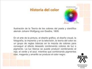Este documento trata sobre la teoría del color. Explica las propiedades básicas del color como el matiz, la saturación y el valor. También describe los modelos de color RGB, CMYK, HSV y HSB. Finalmente, analiza conceptos como la síntesis aditiva y sustractiva, las escalas de grises y la psicología del color.