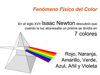 El documento describe los fenómenos físicos del color. Explica que Isaac Newton descubrió que la luz solar se divide en los 7 colores del arcoíris cuando pasa a través de un prisma. También describe que el ojo humano puede ver longitudes de onda de luz entre 380 y 780 nanómetros y que contiene conos y bastones que detectan color y forma.
