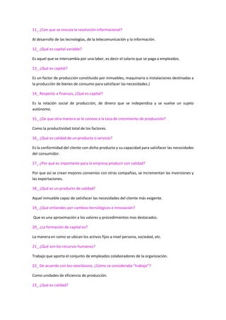El documento resume conceptos clave relacionados con el crecimiento económico, incluyendo teorías de economistas como Adam Smith y Thomas Malthus, factores de producción, tipos de capital, productividad, empleo, calidad, innovación tecnológica y su impacto en el crecimiento a largo plazo. Se definen términos como capital fijo, capital circulante, capital constante, trabajo, y se mencionan los tres factores tradicionales de producción.