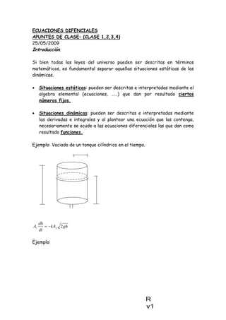 Este documento presenta una introducción a las ecuaciones diferenciales. Explica que mientras las situaciones estáticas se pueden describir con ecuaciones algebraicas, las situaciones dinámicas requieren ecuaciones diferenciales. Define conceptos clave como el orden y grado de una ecuación diferencial, y describe métodos para resolver ecuaciones diferenciales de primer orden, incluyendo métodos para ecuaciones de variables separables, homogéneas y de diferencial exacto.
