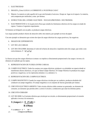 El documento resume los conceptos básicos de electricidad, incluyendo la estructura del átomo, las cargas eléctricas, el campo eléctrico, el campo magnético, los circuitos eléctricos abiertos y cerrados, la ley de Ohm, y la potencia eléctrica. También describe los diferentes tipos de circuitos eléctricos como serie, paralelo y mixto, así como los conductores y aisladores eléctricos.