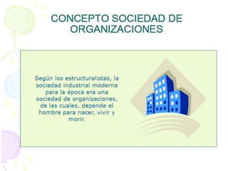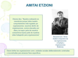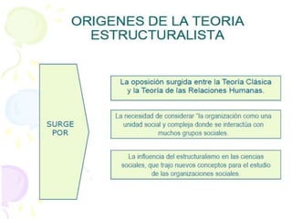 El documento describe la teoría estructuralista y su enfoque en el análisis de organizaciones. Explica que el estructuralismo se centra en las estructuras internas de las organizaciones, sus niveles jerárquicos, y la interacción entre factores internos y externos. También describe los diferentes tipos de organizaciones basadas en su método de control, como organizaciones coercitivas, utilitarias y normativas.