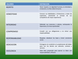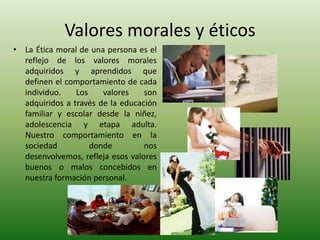 Este documento discute la importancia de los valores morales y éticos. Explica que los valores se adquieren a través de la educación y moldean el comportamiento. También señala que durante la educación superior es importante recibir valores positivos para desarrollarse como profesionales con una ética intachable. Finalmente, afirma que Venezuela actualmente atraviesa una crisis de valores donde se han devaluado principios como el respeto, la honestidad y la responsabilidad ciudadana.
