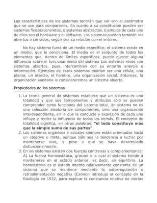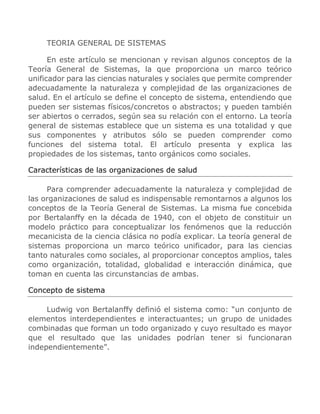 El documento describe los conceptos clave de la Teoría General de Sistemas, incluyendo la definición de sistema como un conjunto de elementos interdependientes e interactuantes que forman un todo organizado. Explica que los sistemas pueden ser físicos o abstractos, abiertos o cerrados, y siempre existen dentro de un medio que los influencia. Las organizaciones de salud se consideran sistemas abiertos que intercambian energía e información con su entorno.