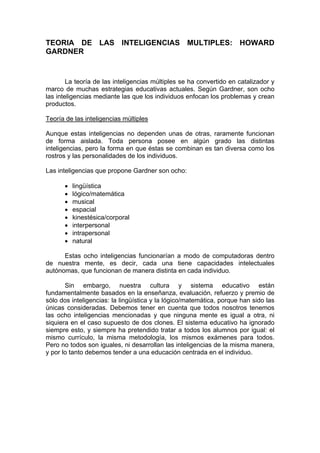 El documento describe la teoría de las inteligencias múltiples de Howard Gardner, la cual propone que los individuos tienen ocho tipos de inteligencia. También discute cómo el sistema educativo actual se enfoca principalmente en dos inteligencias, y sugiere que para mejorar la comprensión se debe reconocer las diferentes formas de inteligencia y presentar los temas desde múltiples perspectivas.