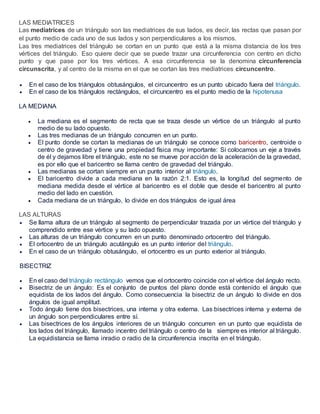 Este documento describe las propiedades geométricas de los triángulos, incluyendo las mediatrices, medianas, alturas y bisectrices. Las mediatrices de un triángulo se cortan en un punto equidistante de los vértices llamado circuncentro. Las medianas se cortan en el baricentro, que divide cada mediana en una proporción de 2:1. Las alturas se cortan en el ortocentro, que puede ser interior u exterior dependiendo del tipo de triángulo. Las bisectrices de los ángulos interiores concurren en el incentro