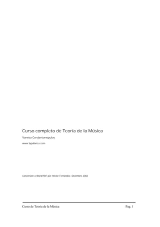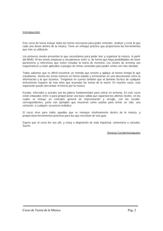 Este documento presenta un resumen del curso completo de Teoría de la Música. El curso consta de 10 niveles que cubren temas como notación musical, escalas, intervalos, acordes, armonía funcional y técnicas avanzadas como improvisación y arreglo musical. El objetivo del curso es proporcionar las herramientas teóricas necesarias para entender, analizar y crear música de una manera práctica.