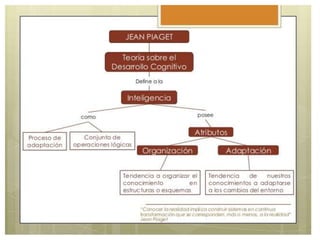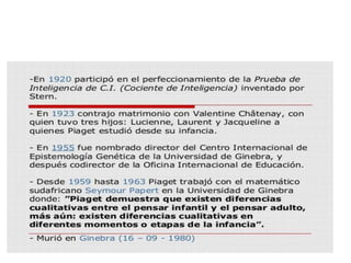 Este documento resume los principales aportes de Jean Piaget a la psicología del desarrollo desde una perspectiva genética. Piaget propuso que el desarrollo cognitivo ocurre a través de estadios estructurados, donde los niños pasan de estructuras mentales más simples a más complejas a través de los mecanismos de asimilación, acomodación y equilibrio/desequilibrio. Identificó estadios sensoriomotores, preoperacionales, concretos y formales. Su enfoque constructivista exam