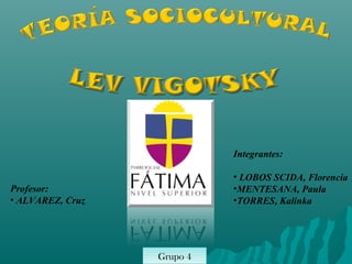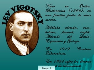 El documento presenta la composición de 4 grupos de trabajo. Los grupos están integrados por 6 estudiantes en total. Además, se incluye información biográfica breve sobre Lev Vigotsky, incluyendo su lugar de nacimiento, idiomas que hablaba y detalles sobre su salud. Finalmente, se enumeran algunos de los planteamientos básicos de su teoría sociocultural del aprendizaje.
