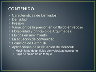 Este documento presenta los conceptos fundamentales de la física de fluidos. Explica la densidad, presión y variación de presión en fluidos en reposo, así como la flotabilidad y el principio de Arquímedes. También cubre fluidos en movimiento, la ecuación de continuidad, la ecuación de Bernoulli y sus aplicaciones, incluido el flujo con velocidad constante y el flujo de salida de un tanque.