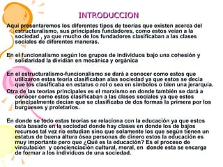 Este documento resume diferentes teorías sociológicas como el funcionalismo, estructuralismo-funcionalismo y marxismo. Explica cómo sus principales pensadores como Durkheim, Parsons, Althusser y Marx clasificaban a la sociedad y las clases sociales. También analiza las ideas de Pierre Bourdieu y cómo estas se relacionan con la teoría marxista de división en burgueses y proletarios. Finalmente, discute cómo estas teorías influyen en la educación y su función de reproducir las clases sociales.