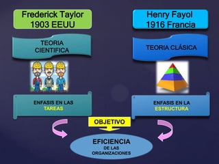 Las teorías clásicas de la administración de Fayol y Taylor surgen a principios del siglo XX. Mientras que Taylor se enfoca en aumentar la eficiencia a través de estudios científicos de tareas, Fayol propone hacerlo a través de la estructura y disposición de los órganos de una organización. Ambas teorías sentaron las bases de la teoría administrativa moderna a pesar de recibir algunas críticas.