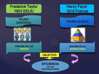 La teoría clásica de la administración surgió en 1916 en Francia de la mano de Henry Fayol. Fayol propuso 14 principios de administración que se enfocan en la estructura y funciones de una organización para lograr eficiencia. Algunos de estos principios incluyen la división del trabajo, autoridad y responsabilidad, y unidad de mando. Fayol también diferenció administración de organización, viendo a la administración como un proceso más amplio del cual la organización es una parte. Su teoría sentó las bases de la administra