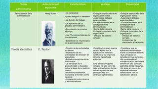 Este documento resume varias teorías administrativas importantes, incluyendo la teoría clásica de la administración de Henry Fayol, la teoría científica de F. Taylor, el enfoque de las relaciones humanas de Elton Mayo, el enfoque de sistemas de Ludwig von Bertalanffy, el enfoque de contingencia de Charles Kindleberger, y el enfoque de recursos humanos. Para cada teoría, se describen sus características principales, ventajas y desventajas.