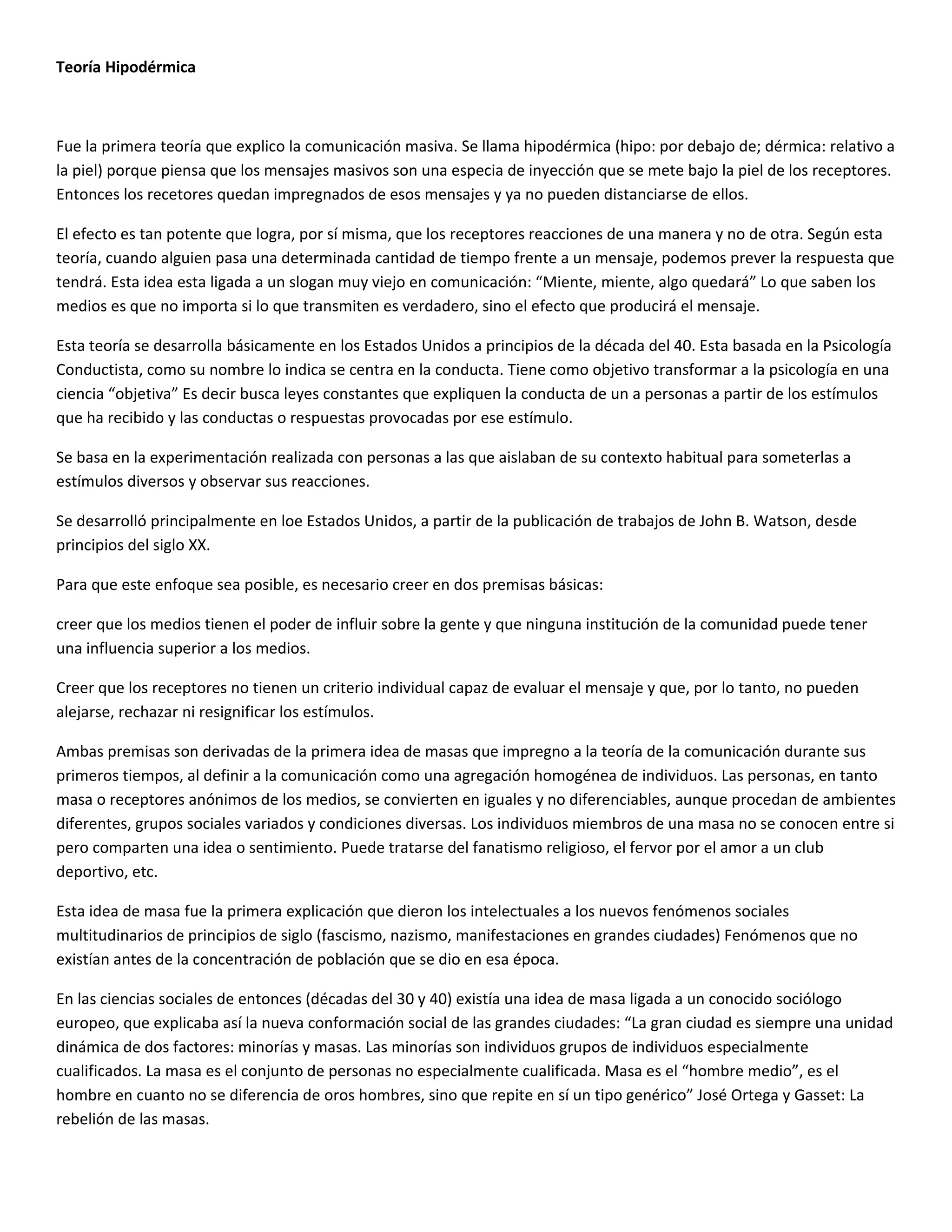 La teoría hipodérmica explica la comunicación masiva como una inyección de mensajes que se introducen bajo la piel de los receptores, impregnándolos e influyendo en su comportamiento de forma predecible. Según esta teoría, los medios masivos tienen un gran poder sobre audiencias pasivas que no pueden evaluar críticamente los mensajes ni resistirse a su influencia. Aunque esta teoría ya no se sostiene, aún influye en la idea de que los medios establecen la agenda pública imponiendo los temas de los que la gente
