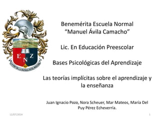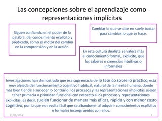 Las teorías implícitas sobre el aprendizaje y la enseñanza son representaciones mentales que guían nuestra práctica aunque no sean conscientes. Estas representaciones se forman a través de procesos de aprendizaje implícito y son difíciles de cambiar aunque se adquieran nuevos conocimientos explícitos. Para modificar las prácticas docentes se requiere reconstruir estas teorías implícitas mediante la explicitación progresiva de las mismas y la integración jerárquica de los conocimientos intuitivos
