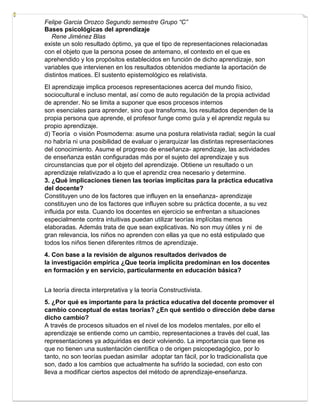 Este documento discute las teorías implícitas del aprendizaje de los docentes. Describe cuatro teorías principales: la teoría directa, la teoría implícita, la teoría constructivista y la teoría posmoderna. Explica las características clave de cada teoría y cómo influyen en la práctica docente. Concluye que es importante promover un cambio conceptual hacia teorías más constructivistas que tengan sustento científico y reconozcan que los estudiantes aprenden de maneras diferentes.
