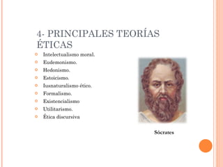Este documento resume las principales teorías éticas como el intelectualismo moral defendido por Sócrates, el eudemonismo de Aristóteles, el hedonismo de los cirenaicos y epicúreos, el estoicismo de Zenón de Citio, el iusnaturalismo ético, el formalismo kantiano, el utilitarismo y la ética discursiva. También describe las ideas centrales de cada teoría en uno o dos párrafos.