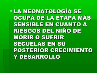 La neonatología se ocupa de la etapa más sensible del niño recién nacido. El documento describe la clasificación, exámenes, métodos de evaluación, patologías comunes y sistema de traslado neonatal. En particular, explica que la derivación oportuna de recién nacidos a centros de mayor complejidad es crucial para brindar atención especializada y así disminuir la morbimortalidad neonatal.