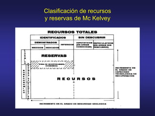 Este documento describe varios métodos para clasificar y estimar recursos y reservas minerales. Explica las categorías de recursos probados, probables e inferidos, y los elementos utilizados como la distancia entre muestras, número de muestras y varianza del krigeado. También cubre métodos geométricos y geoestadísticos para estimar reservas, incluidos métodos de perfiles, triángulos, polígonos, isolíneas y bloques. Resalta que los métodos geoestadísticos como el krigeado proporcion