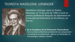 Este documento presenta a Madeleine Leininger, fundadora de la enfermería transcultural. Leininger desarrolló la Teoría de la Diversidad y la Universalidad de los Cuidados Culturales, la cual considera aspectos culturales como la visión del mundo, factores sociales y etnohistoria en el cuidado de enfermería. Sus metaparadigmas incluyen la persona, el entorno, el cuidado y la salud. Leininger buscó estudiar diferentes culturas para comprender mejor las creencias y prácticas de salud entre culturas.