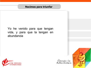 El documento habla sobre las adicciones, sus tipos, características y los tres estados que sufre un adicto: la depresión, la crisis existencial y la soledad emocional. Propone que la teoterapia, o terapia basada en principios cristianos como encontrar el amor de Dios, pedir perdón y fortalecer la vida espiritual a través de la oración y la Palabra, puede ayudar a superar las adicciones.