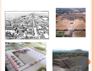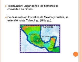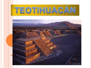 Teotihuacán fue una importante ciudad prehispánica ubicada en el Valle de México que floreció entre los años 100 y 650 d.C. Llegó a tener alrededor de 100,000 habitantes y ejerció una gran influencia cultural en Mesoamérica. La ciudad estaba dividida en zonas ceremonial, residencial y de palacios, y contaba con importantes estructuras como la Pirámide del Sol, la Pirámide de la Luna y la Calzada de los Muertos. Teotihuacán siguió una religión politeísta que veneraba