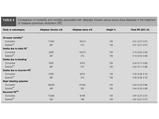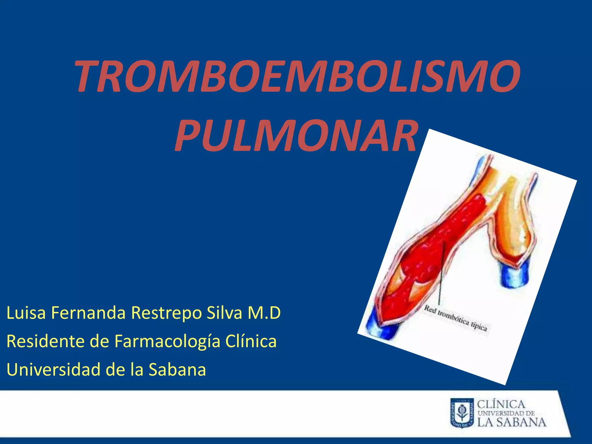 Este documento resume la tromboembolia pulmonar (TEP), incluyendo su epidemiología, factores de riesgo, presentación clínica, diagnóstico, clasificación, tratamiento y estudios clínicos relevantes. En 3 oraciones o menos: