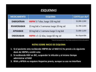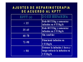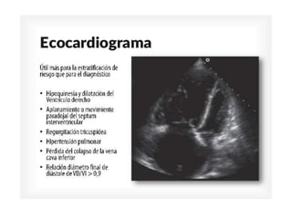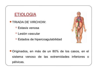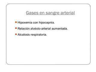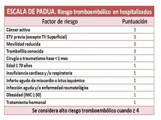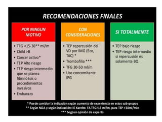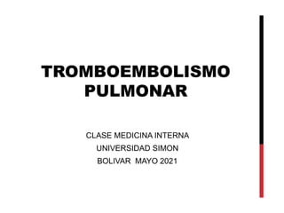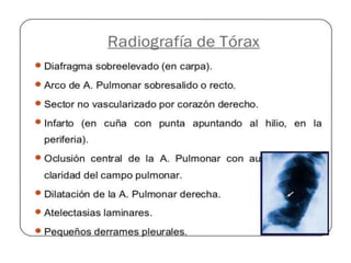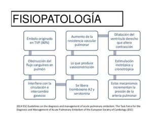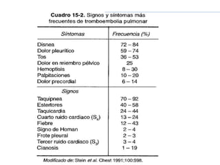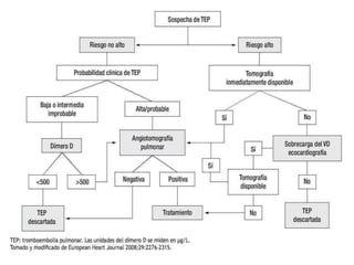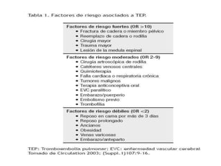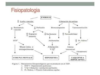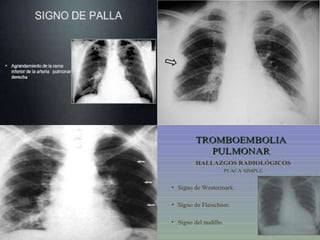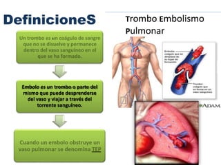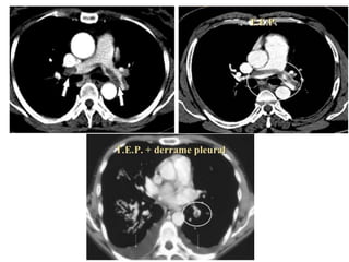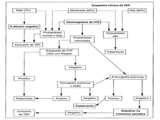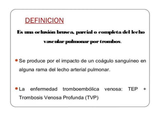 Este documento describe el tromboembolismo pulmonar, incluyendo sus definiciones, tipos de émbolos, factores de riesgo, cuadro clínico, clasificación, diagnóstico mediante pruebas como dímero D, gammagrafía pulmonar, TAC helicoidal y angiografía pulmonar, y tratamiento con heparinas.