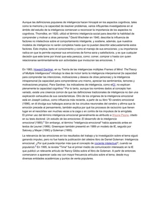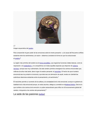 El documento discute la importancia creciente que los investigadores le dan a los aspectos no cognitivos de la inteligencia, como la inteligencia emocional y social. Explica que las emociones juegan un papel fundamental en la memoria y la toma de decisiones debido a la evolución del cerebro, donde las regiones emocionales como la amígdala desarrollaron antes que las regiones cognitivas. También describe cómo los recuerdos emocionales intensos se almacenan en la amígdala.