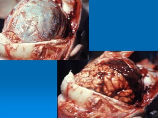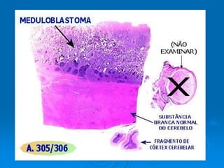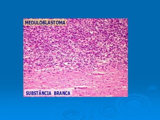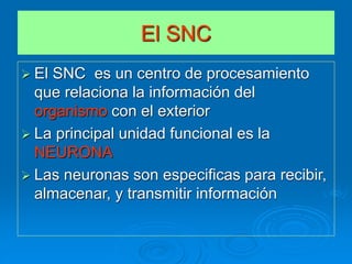 El documento resume las principales patologías del sistema nervioso central. Describe las neuronas y células gliales que componen el tejido nervioso, así como patologías comunes como el edema cerebral, hematomas, enfermedades desmielinizantes como la esclerosis múltiple, enfermedades degenerativas como Alzheimer y Parkinson, y tumores del sistema nervioso central.