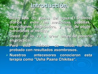 Este documento describe una terapia alternativa basada en el consumo de 1.5 litros de agua pura por la mañana antes de cualquier otra comida o bebida. Se afirma que esta terapia puede curar una variedad de afecciones como estreñimiento, acidez, diabetes, cáncer, tuberculosis y problemas de hipertensión e hipotensión. Explica que el agua pura ayuda a limpiar el colon y mejorar la formación de sangre, lo que conduce a la curación del cuerpo. Recomienda compartir esta información con otros para promover la sal