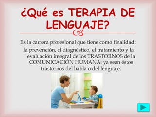 Este documento trata sobre terapia de lenguaje. Explica que la terapia de lenguaje se enfoca en prevenir, diagnosticar, tratar y evaluar trastornos de la comunicación humana, ya sean del habla o del lenguaje. Describe los componentes del lenguaje, diferentes tipos de trastornos del habla y lenguaje, y cuando es necesario terapia de lenguaje. También resume los pasos básicos para realizar terapia de lenguaje.