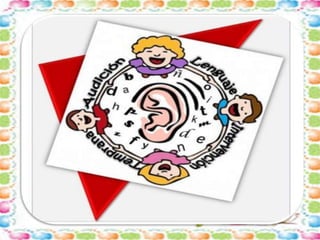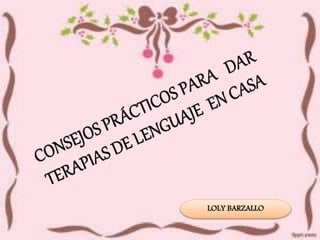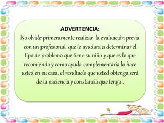 El documento habla sobre las estrategias que los padres pueden implementar en casa para ayudar a sus hijos con retraso en el habla o lenguaje. Recomienda realizar masajes faciales, jugar con espejos, tarjetas ilustradas, ejercicios con la lengua y soplar, ejercicios de dicción con lápiz, y usar videos musicales infantiles. El objetivo es estimular el lenguaje a través del juego y la interacción diaria para obtener buenos resultados y ayudar a que los niños se puedan comunicar mejor.