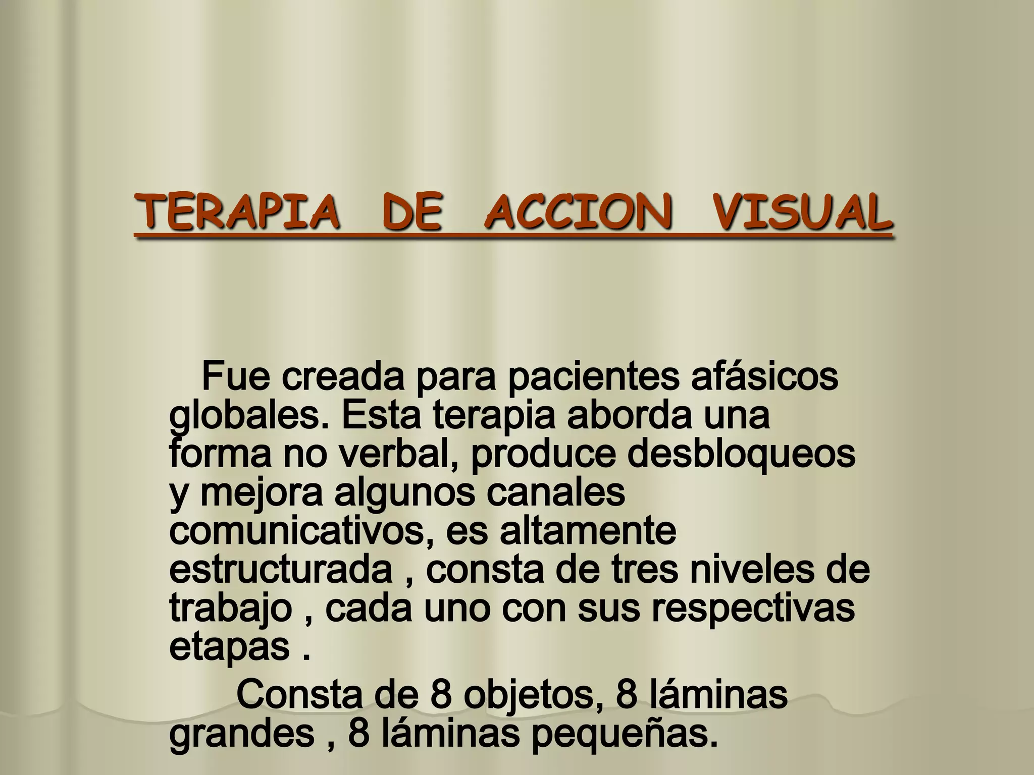 Este documento describe varias terapias para pacientes afásicos, incluyendo terapia de acción visual, terapia de entonación melódica, técnica PACE y terapias para pacientes fluentes poco informativos. La terapia de acción visual utiliza objetos, láminas y gestos para mejorar la comunicación no verbal a través de tres niveles. La terapia de entonación melódica involucra el canto y repetición de palabras para mejorar la fluidez a través de tres niveles. La técnica PACE promueve la