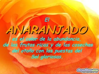 El documento describe los colores del arco iris y sus significados. El anaranjado representa la abundancia, el amarillo la felicidad, el azul la vida, el verde la naturaleza y la esperanza, el rojo la energía y la pasión, el rosado el amor y la paz, y el violeta la transformación y los sueños. En general, la vida es un hermoso arco iris que trae alegría y amor después de la lluvia.