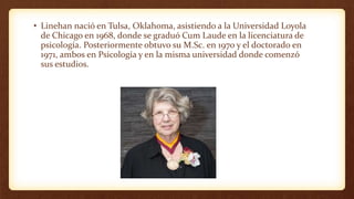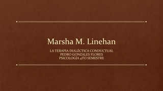 La terapia dialéctica conductual fue desarrollada por Marsha Linehan para tratar trastornos limítrofes de la personalidad. Combina terapia individual y enseñanzas sobre conciencia plena, habilidades interpersonales y regulación emocional. Se ha adaptado para tratar otros problemas como depresión, ansiedad, ira e impulsividad, y se usa actualmente para tratar discapacidades en el desarrollo y delincuentes juveniles.