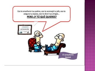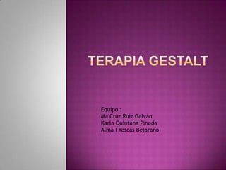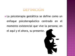 La psicoterapia gestáltica se centra en el momento presente y en vivir el aquí y el ahora. Se originó en Alemania en 1912 por Max Wertheimer, Kurt Koffa y Wolfan Kohler y se basa en la percepción del organismo y el medio como un todo. El enfoque pone énfasis en lo que está sucediendo, pensando y sintiendo en el momento presente a través de la atención, aceptación de la experiencia y responsabilidad personal. El propósito de la Gestalt es ayudar al individuo a convertirse en un todo