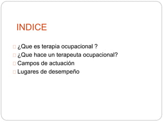 La terapia ocupacional es una disciplina de la salud que busca promover la participación efectiva de individuos, con o sin discapacidad, en actividades significativas de la vida diaria, contribuyendo a su bienestar y calidad de vida. Los terapeutas ocupacionales evalúan las necesidades de sus pacientes y facilitan el desarrollo de habilidades, adaptan entornos y fomentan la motivación hacia el 'hacer'. Esta práctica abarca diversas poblaciones y se aplica en múltiples entornos, incluidos hospitales, comunidades y hogares.